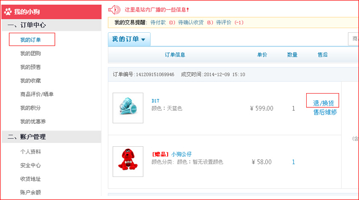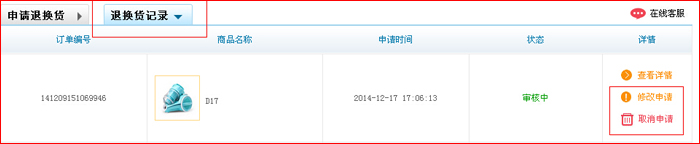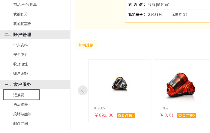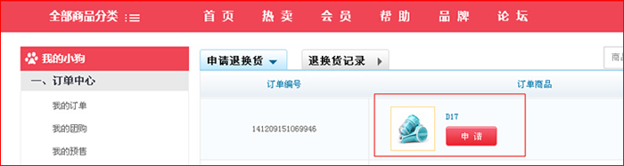 第二步:點擊“我的訂單“退換貨直接進入退換貨頁面,或客戶服務(wù)下”退換貨“,點擊申請。
