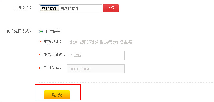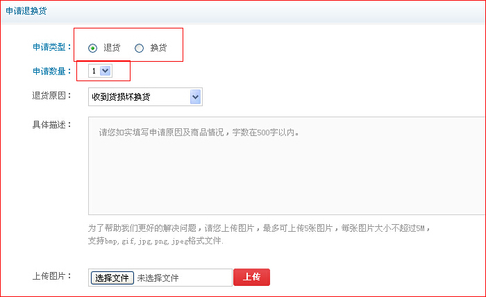 第三步:選擇”退貨“或者”換貨“,然后按要求填寫退換貨內(nèi)容,填寫完畢后點”提交“按鈕。