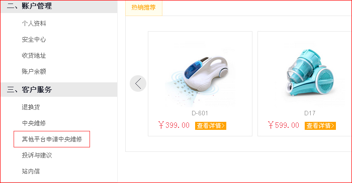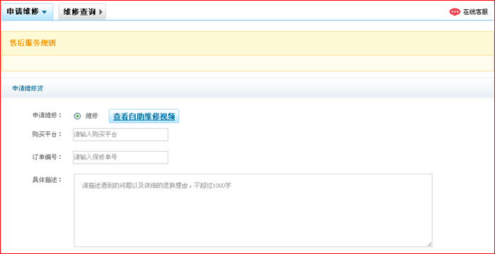 | 一、其他平臺(tái)(天貓、京東、蘇寧易購(gòu)、國(guó)美、唯品會(huì)、當(dāng)當(dāng))申請(qǐng)售后維修 第一步:注冊(cè)官方商城賬號(hào),注冊(cè)完成后,點(diǎn)擊“我的小狗”,進(jìn)入個(gè)人中心頁(yè)面,若您已經(jīng)有商城賬號(hào)可直接登錄。(點(diǎn)擊查看:注冊(cè)登陸步驟) 第二步:點(diǎn)擊售后服務(wù)下“其他平臺(tái)申請(qǐng)售后維修”,進(jìn)入非官方商城維修申請(qǐng)與查詢頁(yè)面。 ![]() 第三步:點(diǎn)擊“維修申請(qǐng)”,按提示填寫相關(guān)信息,填寫完畢后請(qǐng)仔細(xì)核對(duì)信息,沒問題點(diǎn)擊“保存”。 ![]() ![]() 第四步:申請(qǐng)審核通過后,我們會(huì)以短信的形式將維修單號(hào)發(fā)往您申請(qǐng)信息中預(yù)留的手機(jī)號(hào)上,您可在“維修查詢”中根據(jù)維修單號(hào)查詢維修進(jìn)度。 ![]() 二、其他平臺(tái)(天貓、京東、蘇寧易購(gòu)、國(guó)美、唯品會(huì)、當(dāng)當(dāng))維修查詢 第一步:注冊(cè)官方商城賬號(hào),注冊(cè)完成后,點(diǎn)擊“我的小狗”,進(jìn)入個(gè)人中心頁(yè)面,若您已經(jīng)有商城賬號(hào)可直接登錄。(點(diǎn)擊查看:注冊(cè)登陸步驟) 第二步:點(diǎn)擊售后服務(wù)下“其他平臺(tái)申請(qǐng)售后維修”,進(jìn)入非官方商城維修申請(qǐng)與查詢頁(yè)面。 ![]() ![]() 第三步:將小狗短信推送您的維修單號(hào)輸入框內(nèi),填寫驗(yàn)證碼,點(diǎn)擊“確定”即可查詢。 ![]() 三、手機(jī)端“售后維修申請(qǐng)與查詢” 第一步:注冊(cè)官方商城賬號(hào),注冊(cè)完成后,點(diǎn)擊“我的小狗”,進(jìn)入個(gè)人中心頁(yè)面,若您已經(jīng)有商城賬號(hào)可直接登錄。(點(diǎn)擊查看:注冊(cè)登陸步驟) 第二步:點(diǎn)擊“會(huì)員”,進(jìn)入會(huì)員中心。點(diǎn)擊“售后維修-維修申請(qǐng)”進(jìn)行維修申請(qǐng);點(diǎn)擊“售后維修-查看維修進(jìn)度”進(jìn)行維修進(jìn)度查詢。 |